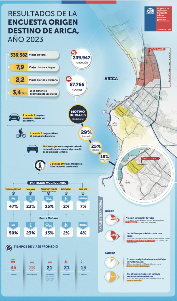Para el subsecretario de Transportes, Jorge Daza, estos análisis no sólo coinciden con otros resultados de EOD ya ejecutadas, sino también “representan una oportunidad para atender hoy el crecimiento de los modos motorizados, en este caso vehículos particulares, especialmente como factores que generan congestión y mayores tiempos de desplazamiento. Por lo mismo, tener claridad de cómo se mueven los habitantes de Arica, sin duda, es una información valiosa que nos permite mirar con claridad hacia el futuro, apostando con mayor energía a proyectos que fortalezcan la movilidad sostenible y eficiente, para incentivar el uso de los modos activos y el transporte público, con buses más modernos, seguros y sustentables, como los 12 que prontamente comenzarán a funcionar en Arica”, indicó.