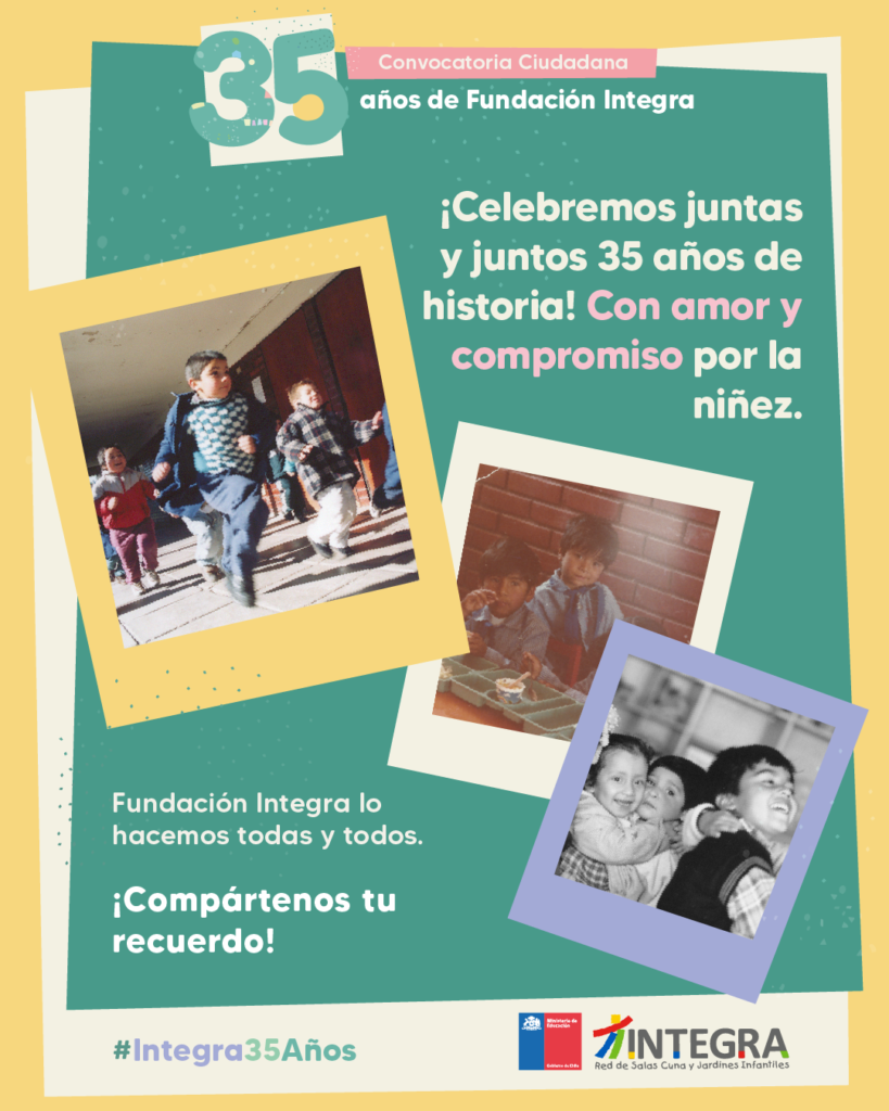 Es por ello que, como una manera de preservar ese legado y proyectarlo hacia los próximos 35 años, a partir del miércoles 23 de julio las familias podrán participar de una Convocatoria Ciudadana que buscará, a través de las imágenes que posean de su etapa en la Educación Parvularia Pública, plasmar la historia de Fundación Integra.