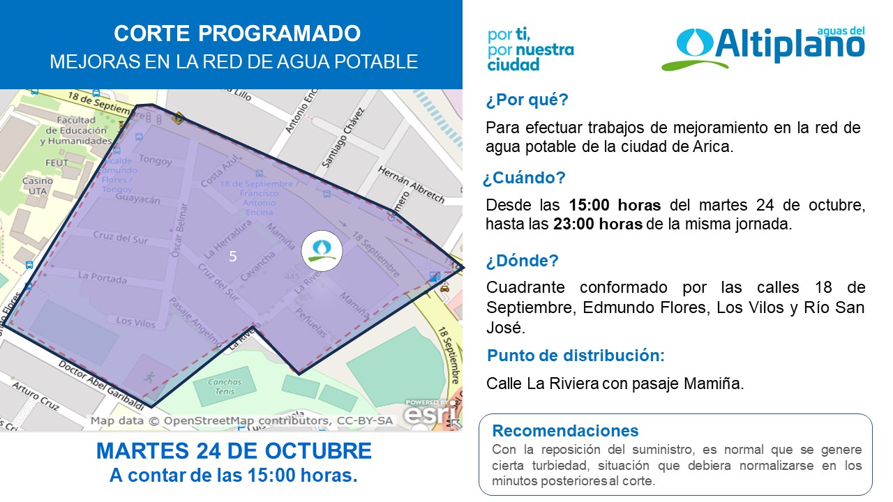 Según indicó Marcos Lastra Agurto, Jefe del Departamento de Redes de Agua Potable de Aguas del Altiplano, para el martes 24 se dispondrá de un punto de distribución de agua alternativo el cual estará ubicado en calle La Riviera con Mamiña.
