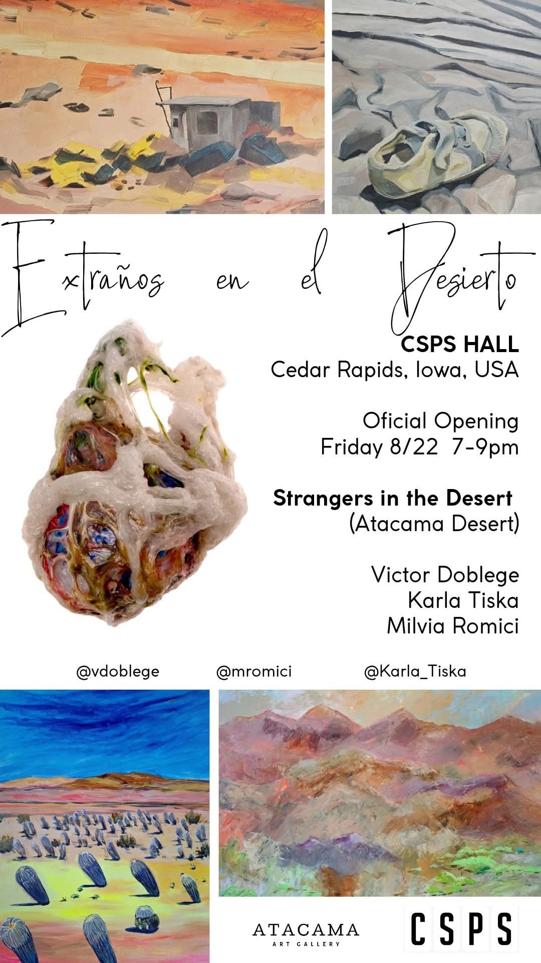 El viernes 22 de agosto se inauguró en la Galería de Arte CSPS Hall, en Cedar Rapids, Iowa (EE.UU.), la exposición “Extraños en el desierto: el desierto de Atacama y sus desafíos”, una muestra colectiva que reúne a los artistas visuales Víctor Doblege, Karla Tiska y Milvia Romici, la exposición permanecerá abierta hasta el viernes 29 de agosto.