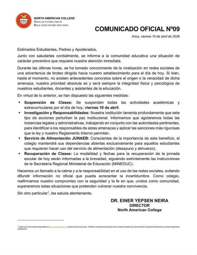 InicioDestacada 10 abril, 2026 FacebookInstagramTwitterYoutube Últimas noticias Destacada PDI Arica detuvo a imputado por abuso sexual de menor de edad Destacada Informan sobre beneficio de gas licuado para Arica y Parinacota Destacada Tribunal ambiental : Realizan audiencia revisión de medida cautelar que mantiene la suspensión de faenas de Quiborax Destacada GENDARMERÍA CONMEMORÓ EL 27 ANIVERSARIO DEL COMPLEJO PENITENCIARIO DE ARICA Atención : Colegio North American College suspende clases tras amenaza de tiroteo viralizada en redes sociales Cuota FacebookTwitterPinterestWhatsApp A través de un comunicado oficial y tras una serie de consultas de apoderados respecto a una amenaza de tiroteo, viralizada en rrss y anunciado para este viernes 10 de abril, el colegio decidió suspender las clases: Comentarios Dejanos tus comentarios 10 abril, 2026 admin FacebookInstagramTwitterYoutube Relacionadas Destacada PDI Arica detuvo a imputado por abuso sexual de menor de edad Destacada Informan sobre beneficio de gas licuado para Arica y Parinacota Destacada Tribunal ambiental : Realizan audiencia revisión de medida cautelar que mantiene la suspensión de faenas de Quiborax Destacada GENDARMERÍA CONMEMORÓ EL 27 ANIVERSARIO DEL COMPLEJO PENITENCIARIO DE ARICA Destacada SENCE impulsa a las MIPEs con cursos gratuitos de inglés y gestión Latest Posts Destacada PDI Arica detuvo a imputado por abuso sexual de menor de edad Destacada Informan sobre beneficio de gas licuado para Arica y Parinacota Destacada Tribunal ambiental : Realizan audiencia revisión de medida cautelar que mantiene la suspensión de faenas de Quiborax Destacada GENDARMERÍA CONMEMORÓ EL 27 ANIVERSARIO DEL COMPLEJO PENITENCIARIO DE ARICA