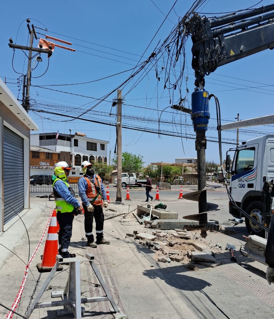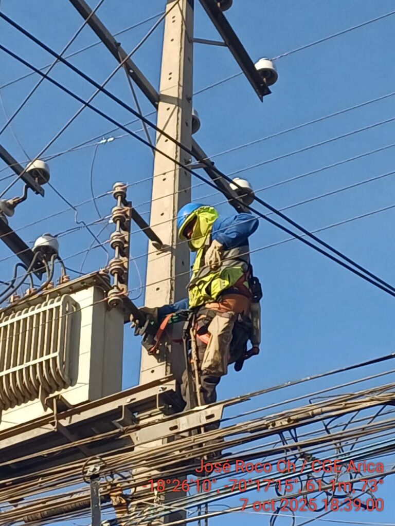 Como parte de su servicio de atención de emergencias, CGE ejecutó trabajos especiales para reemplazar un poste de la red eléctrica en calle Barros Arana, esquina Linderos, en la ciudad de Arica. La estructura fue impactada por terceros, lo que obligó a realizar un corte programado de energía en el sector para permitir la intervención segura de las brigadas técnicas.