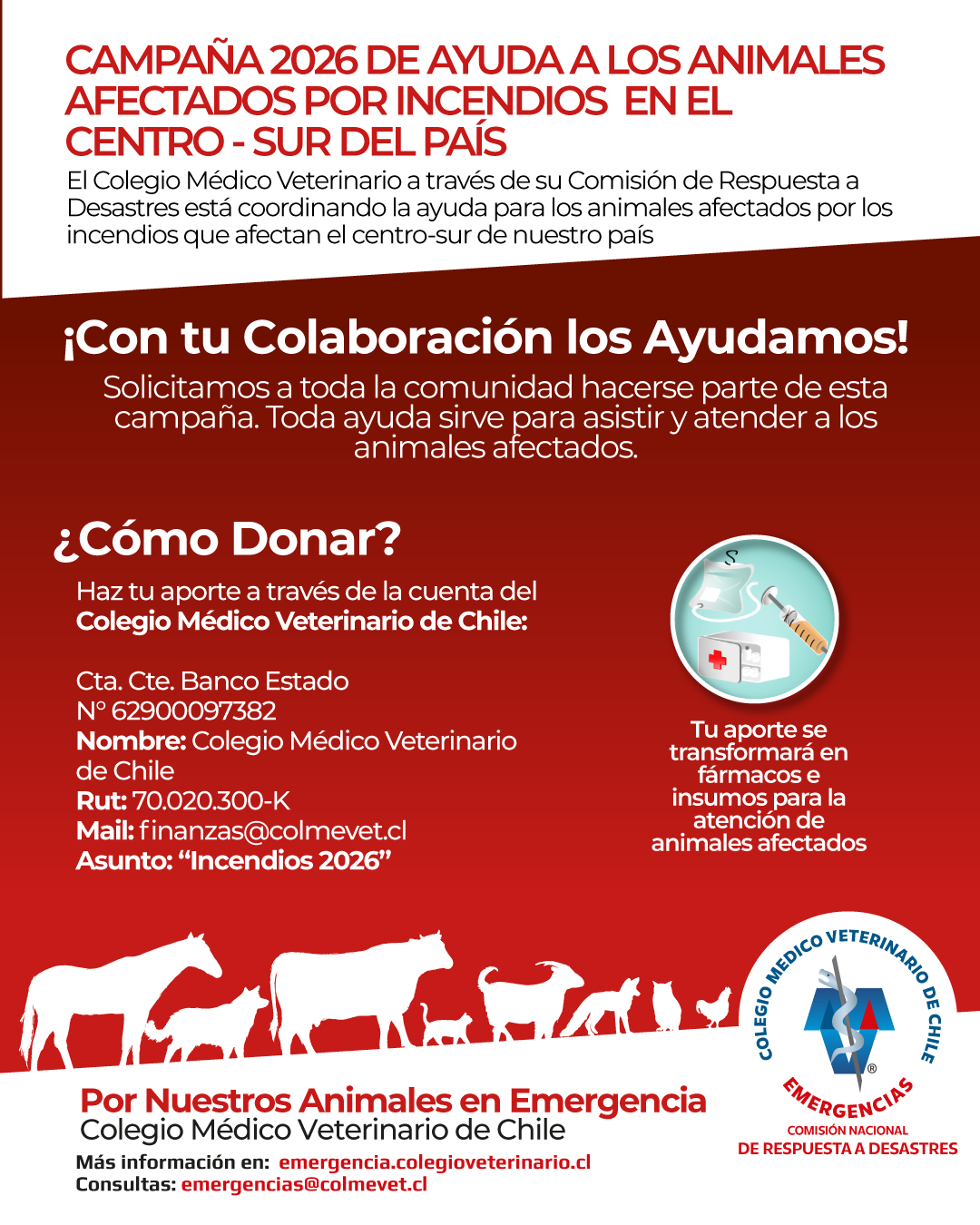 Debido a la magnitud de la catástrofe por incendios forestales en las Regiones de Biobío y Ñuble, el Colegio Médico Veterinario de Chile (Colmevet) a través de su Comisión Nacional de Respuesta a Desastres (CNRD), dio inició a la campaña oficial de donación de recursos a través de la cuenta oficial de Banco Estado, para enfrentar la emergencia en su dimensión animal. Esto, para la atención médica veterinaria que se está realizando y que durará meses, dado el tipo de lesiones que presentan los animales.