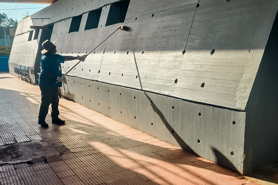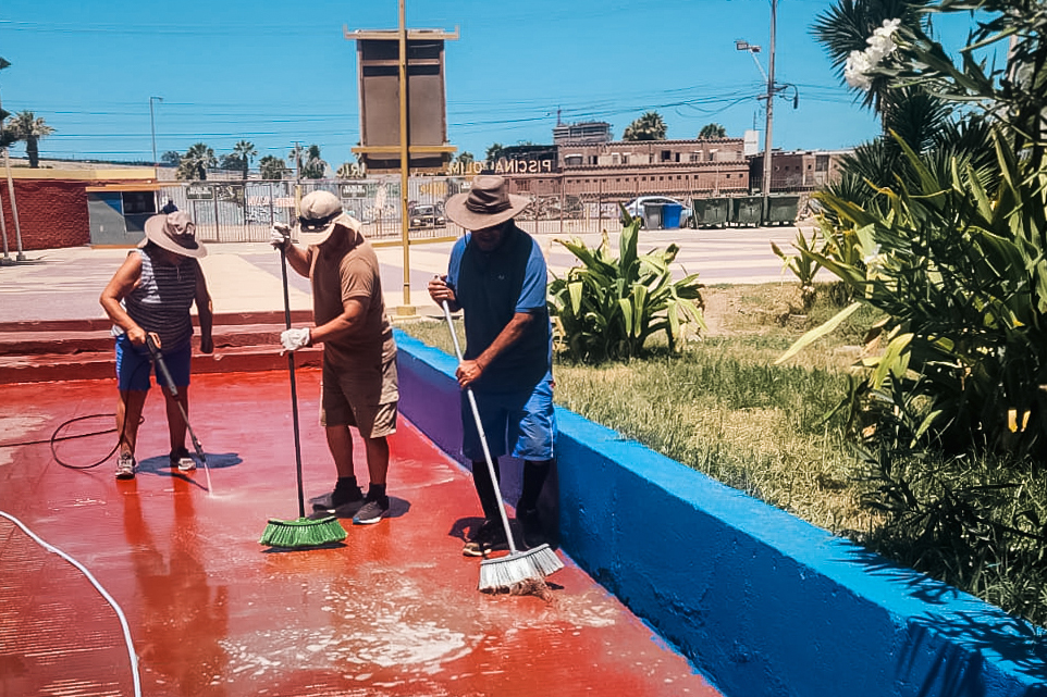 Patricio Melo, funcionario de la oficina de deportes y persona a cargo de la limpieza de la piscina olímpica se refirió a los trabajos realizados  “Limpiamos con hidro lavadora las paredes de la piscina, enceramos, recogimos la tierra de los alrededores, sacamos la mitad del agua y se limaron las baldosas con filo. Al final se aspiró y se recogió todo. Habían hasta algas. Ahora vamos a recoger todo lo que estaba botado en la parte de atrás. Tenemos un convenio para hacer un brandeo de las galerías prontamente”.