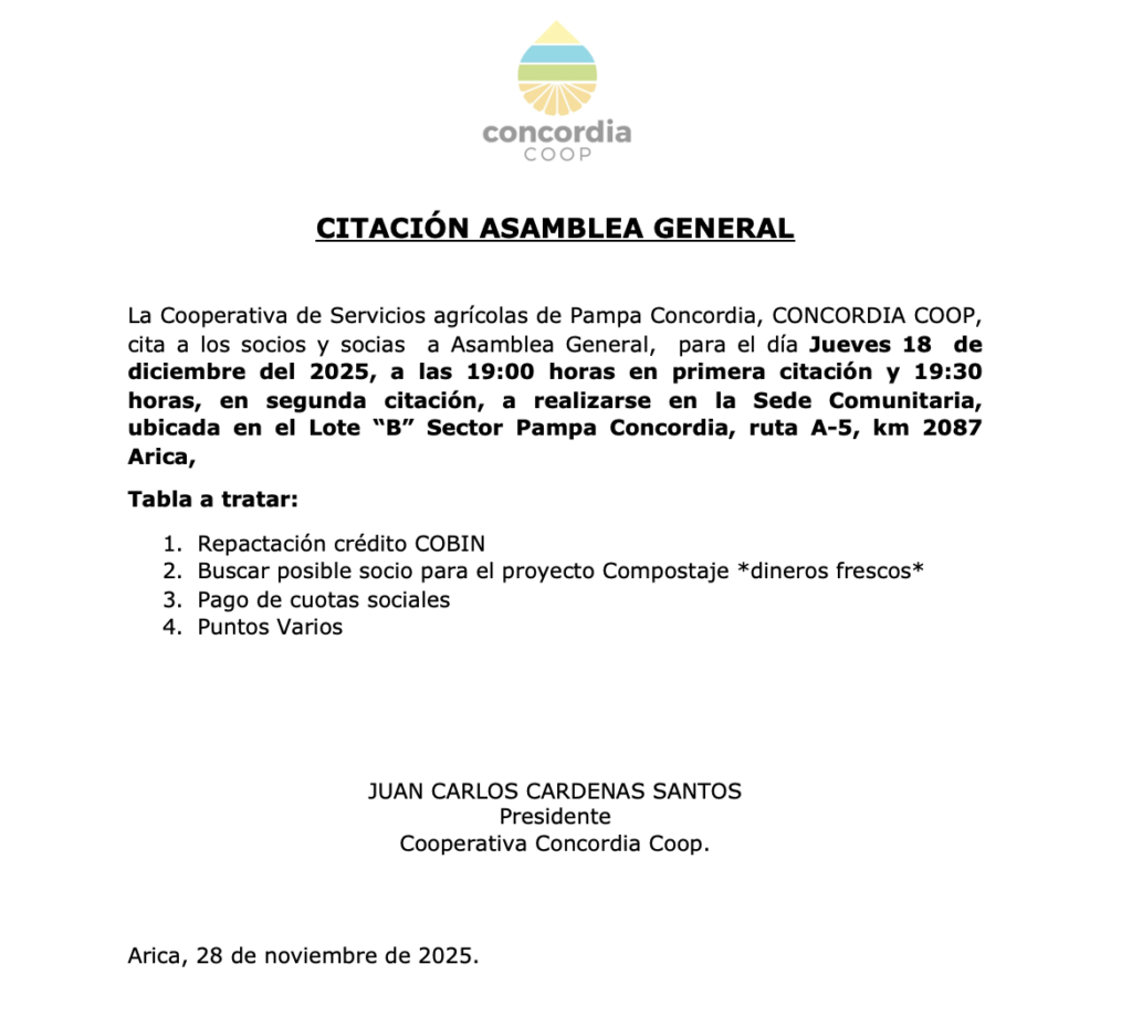 InicioDestacada 30 noviembre, 2025 FacebookInstagramTwitterYoutube Últimas noticias Destacada Municipalidad de Camarones celebra la sabiduría y trayectoria de las personas mayores en encuentro comunal Destacada Stand informativo promueve una Navidad segura y un consumo responsable en Arica Destacada Con ceremonia Servicio de Salud Arica y Parinacota culminó taller de reinserción social Destacada SLEP Chinchorro y Servicio de Protección Especializada firman protocolo en favor de la niñez Concordia Coop: Citación Asamblea General Cuota FacebookTwitterPinterestWhatsApp Comentarios Dejanos tus comentarios 30 noviembre, 2025 admin FacebookInstagramTwitterYoutube Relacionadas Destacada Municipalidad de Camarones celebra la sabiduría y trayectoria de las personas mayores en encuentro comunal Destacada Stand informativo promueve una Navidad segura y un consumo responsable en Arica Destacada Con ceremonia Servicio de Salud Arica y Parinacota culminó taller de reinserción social Destacada SLEP Chinchorro y Servicio de Protección Especializada firman protocolo en favor de la niñez Destacada Arica y Parinacota destaca a nivel nacional con alza sostenida en ocupaciones y visitantes durante el segundo semestre 2025 Latest Posts Destacada Municipalidad de Camarones celebra la sabiduría y trayectoria de las personas mayores en encuentro comunal Destacada Stand informativo promueve una Navidad segura y un consumo responsable en Arica Destacada Con ceremonia Servicio de Salud Arica y Parinacota culminó taller de reinserción social Destacada SLEP Chinchorro y Servicio de Protección Especializada firman protocolo en favor de la niñez