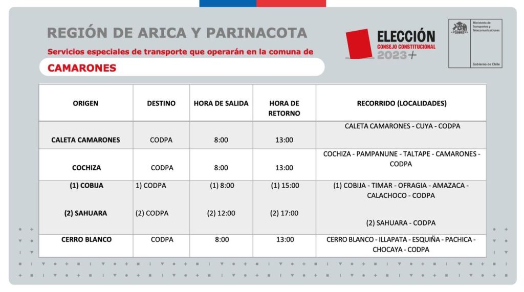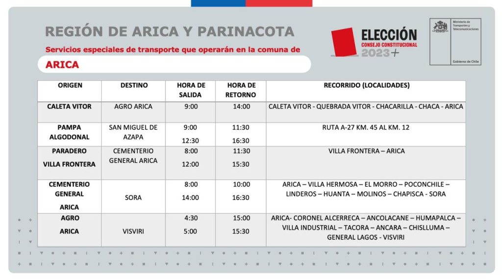 Con 22 servicios gratuitos contará la región de Arica y Parinacota, de cara al proceso eleccionario que se vivirá este domingo 7 de mayo, como parte de las medidas adoptadas por el Ministerio de Transportes y Telecomunicaciones (MTT) para facilitar el traslado hacia los diferentes locales de votación.
