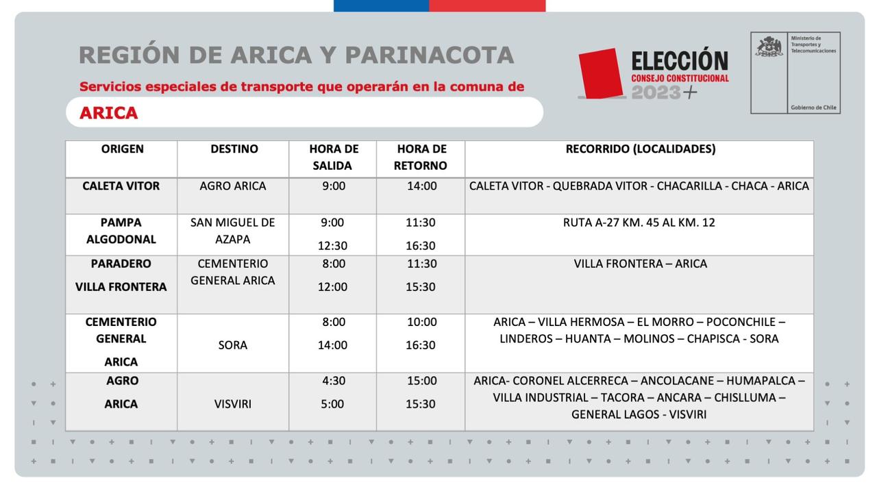 Con 22 servicios gratuitos contará la región de Arica y Parinacota, de cara al proceso eleccionario que se vivirá este domingo 7 de mayo, como parte de las medidas adoptadas por el Ministerio de Transportes y Telecomunicaciones (MTT) para facilitar el traslado hacia los diferentes locales de votación.