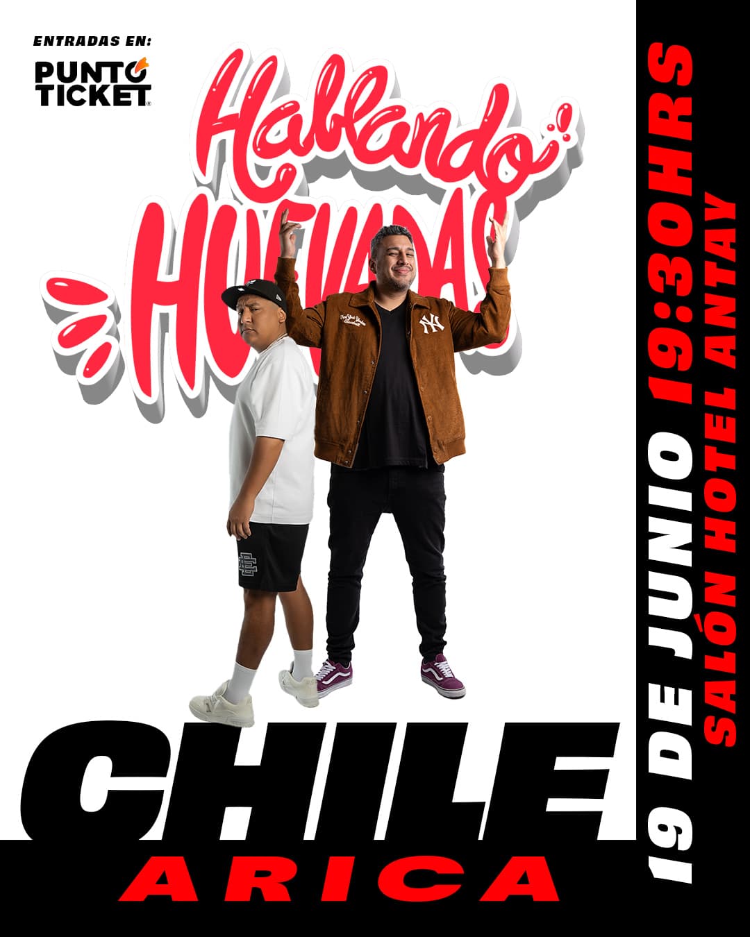 El famoso dúo peruano de comedia, Hablando Huevadas, conformado por Jorge Luna y Ricardo Mendoza, se preparan para presentarse por primera vez en Arica el próximo jueves 19 de junio a las 19:00 horas en el Salón de Eventos Antay de Hotel Antay de la Ciudad.
