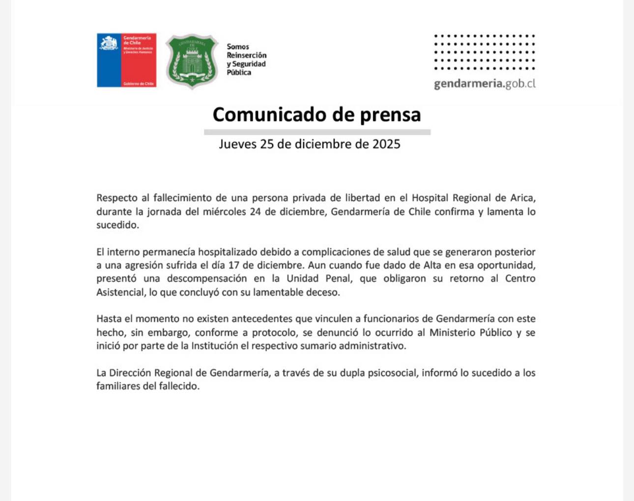 Por su parte la Fiscalía Arica confirmó la realización de una investigación penal por el hecho. La víctima mantenía graves lesiones tras agresión en el recinto penal.