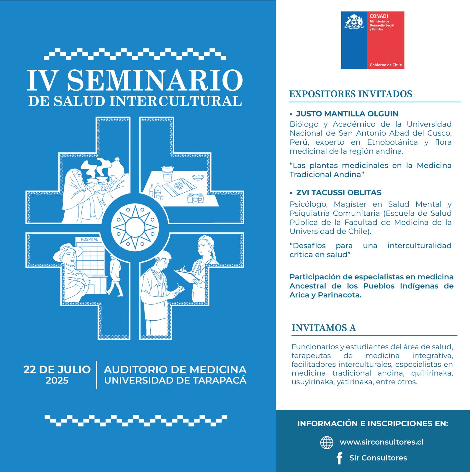 El “IV Seminario de Salud Intercultural” se llevará a cabo, a partir de las 8:30 horas en el Auditorio de la Facultad de Medicina de la Universidad de Tarapacá, y está dirigido a todo público interesado en informarse y conocer sobre la medicina ancestral y la salud intercultural. La participación es gratuita, solo requiere inscripción previa a través del formulario disponible en la página web www.sirconsultores.cl