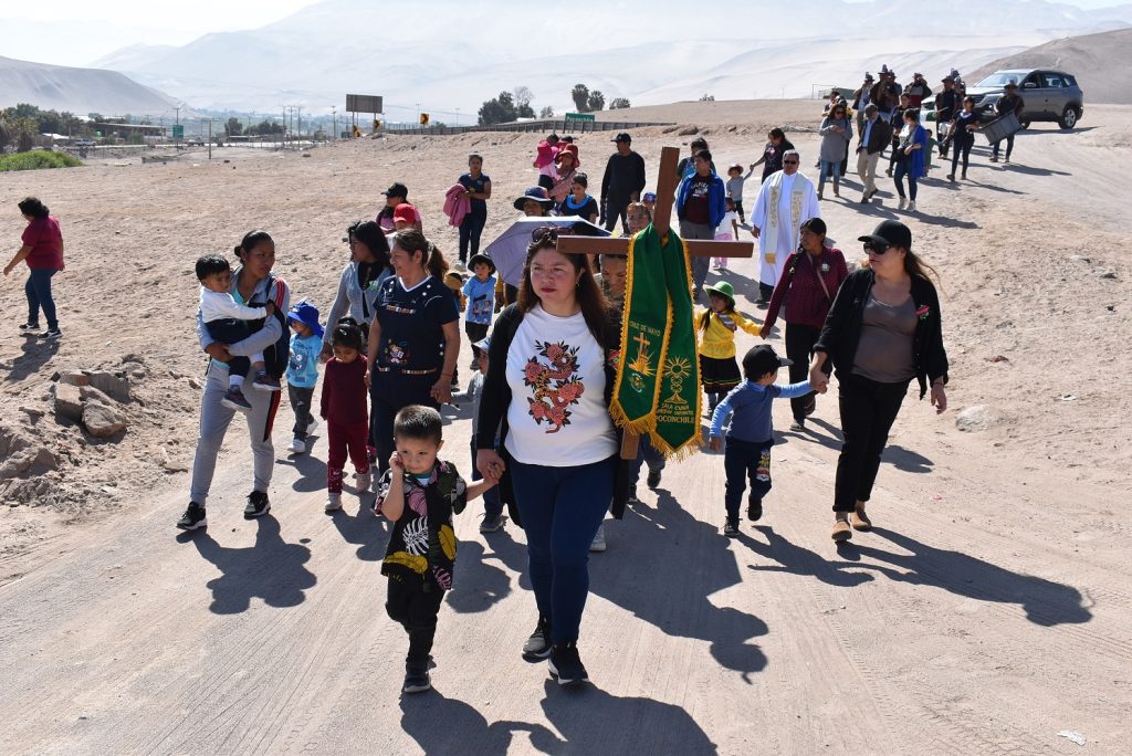 Como dicta la tradición, la cruz una vez “vestida” es trasladada en procesión desde el cerro hacia el jardín infantil en donde queda hasta el próximo año, recorrido que encabezó portándola junto a su hijo la apoderada Lilian Amaro, del nivel medio.