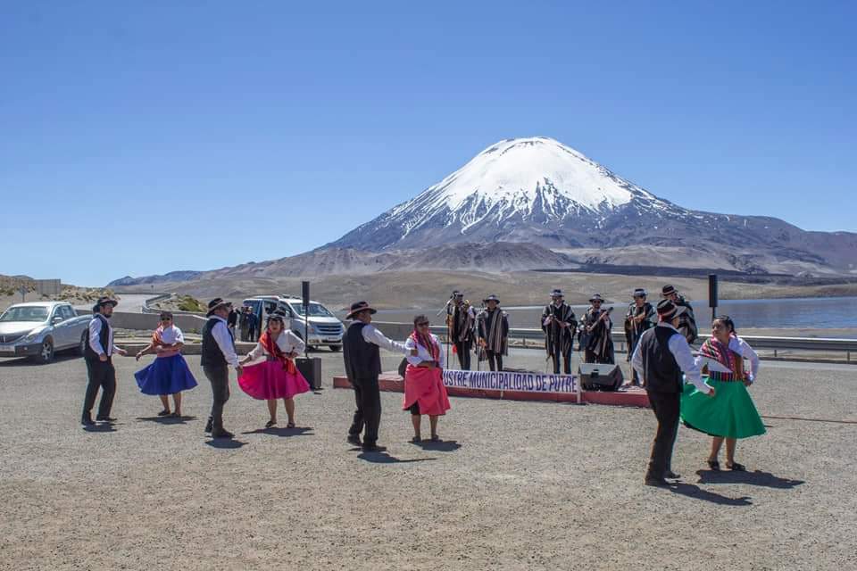 Entre las cumbres de los volcanes y nevados que rodean el Lago Chungará se escucharon las canciones interpretadas por destacados cultores y cultoras de la comuna de Putre, quienes participaron en el «Tercer Encuentro de Cultores y Danzas Andinas», organizado por la Municipalidad de Putre y financiado por el Ministerio de las Culturas, el Patrimonio y las Artes que contó con el apoyo de Conaf.