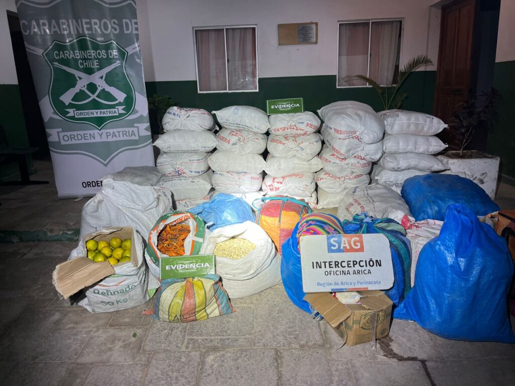 Un exitoso y contundente procedimiento desarrollado en la Ruta Internacional 11-CH permitió a Carabineros de la Sección de Investigación Policial, SIP de la Cuarta Comisaría Chacalluta, en coordinación con personal del Servicio Agrícola y Ganadero (SAG), detectar e incautar una significativa cantidad de productos de origen agropecuario que ingresaban de manera ilegal al territorio nacional, avaluados en aproximadamente 2 millones de pesos.