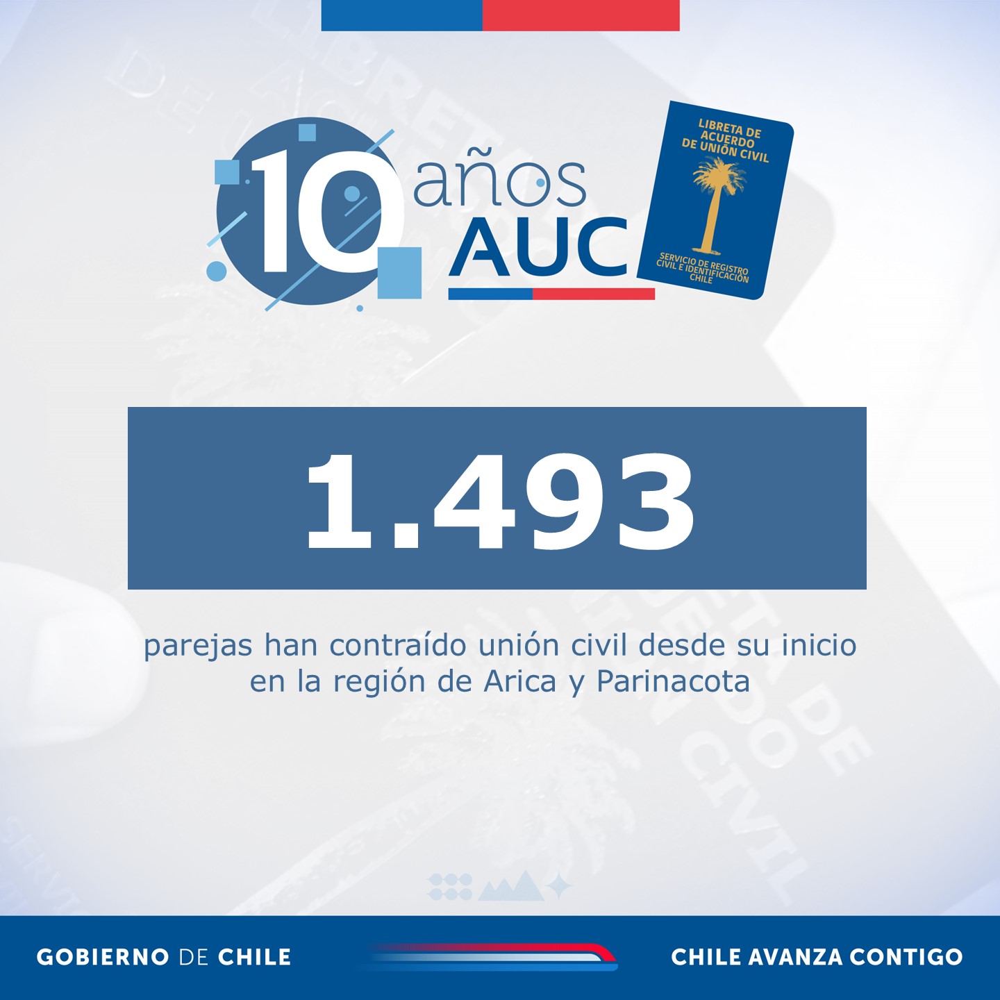 El 22 de octubre de 2015 se celebró el primer Acuerdo de Unión Civil (AUC) en Chile, iniciando una década de transformaciones en materia de derechos civiles y reconocimiento de la diversidad familiar. A diez años de ese hito, el Servicio de Registro Civil e Identificación informa que se han celebrado 98.379 uniones civiles en todo el país, de las cuales 1.493 corresponden a la Región de Arica y Parinacota.