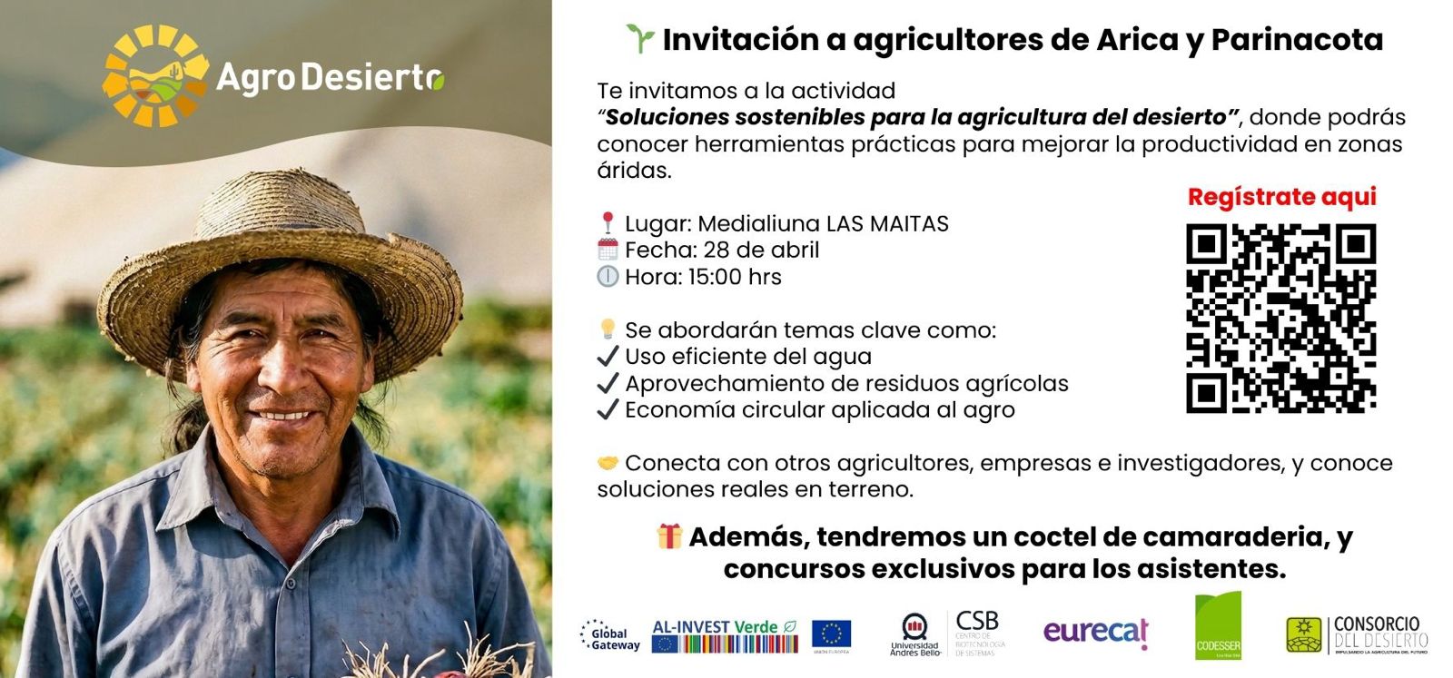 La actividad se realizará en la Medialuna Las Maitas, en el kilómetro 10 del Valle de Azapa, a partir de las 15 horas. Allí se abordarán temáticas relevantes tales como el uso eficiente del recurso hídrico, la valorización de residuos agrícolas y la implementación de prácticas de economía circular, con foco en su aplicación en el territorio.