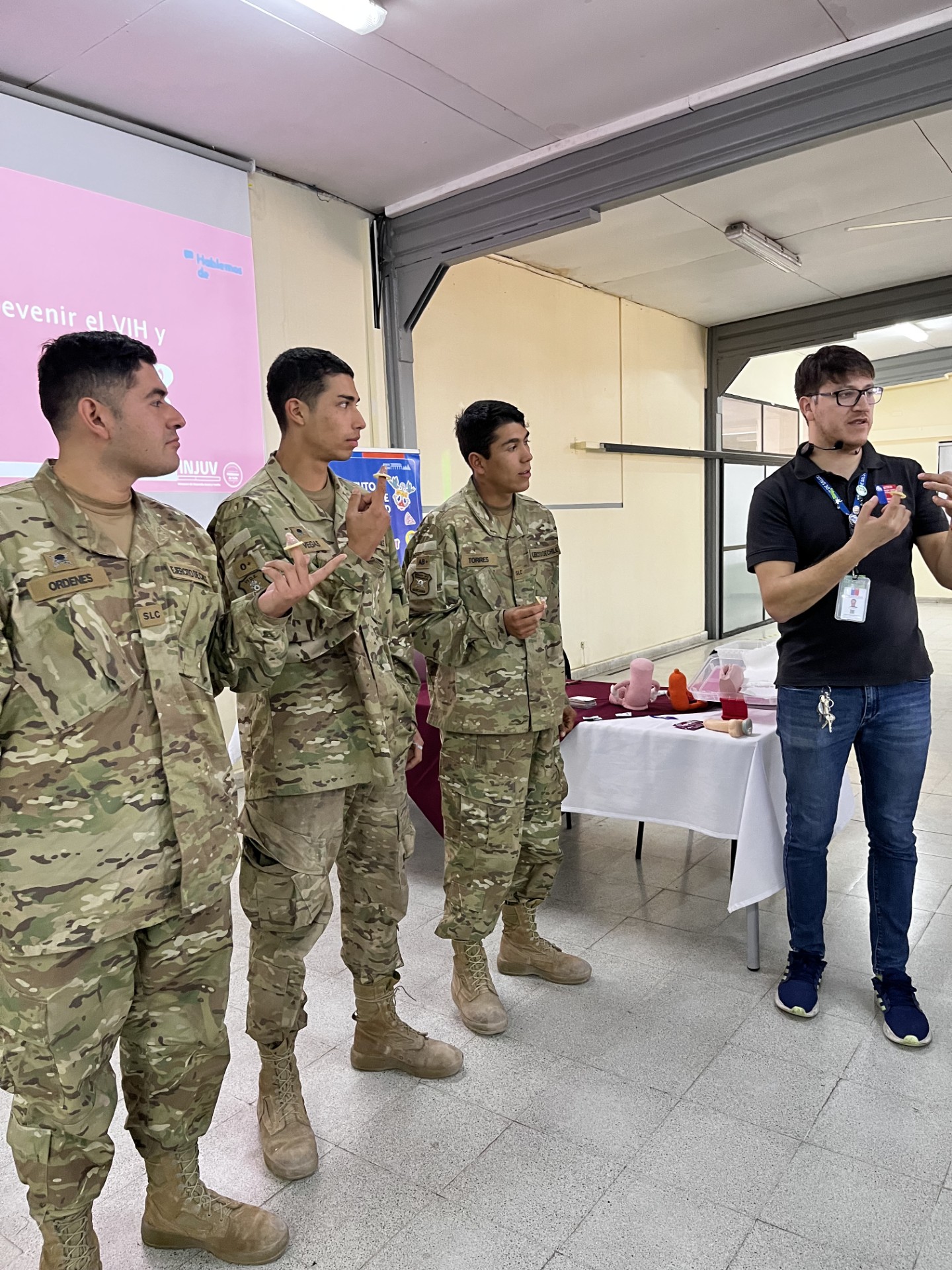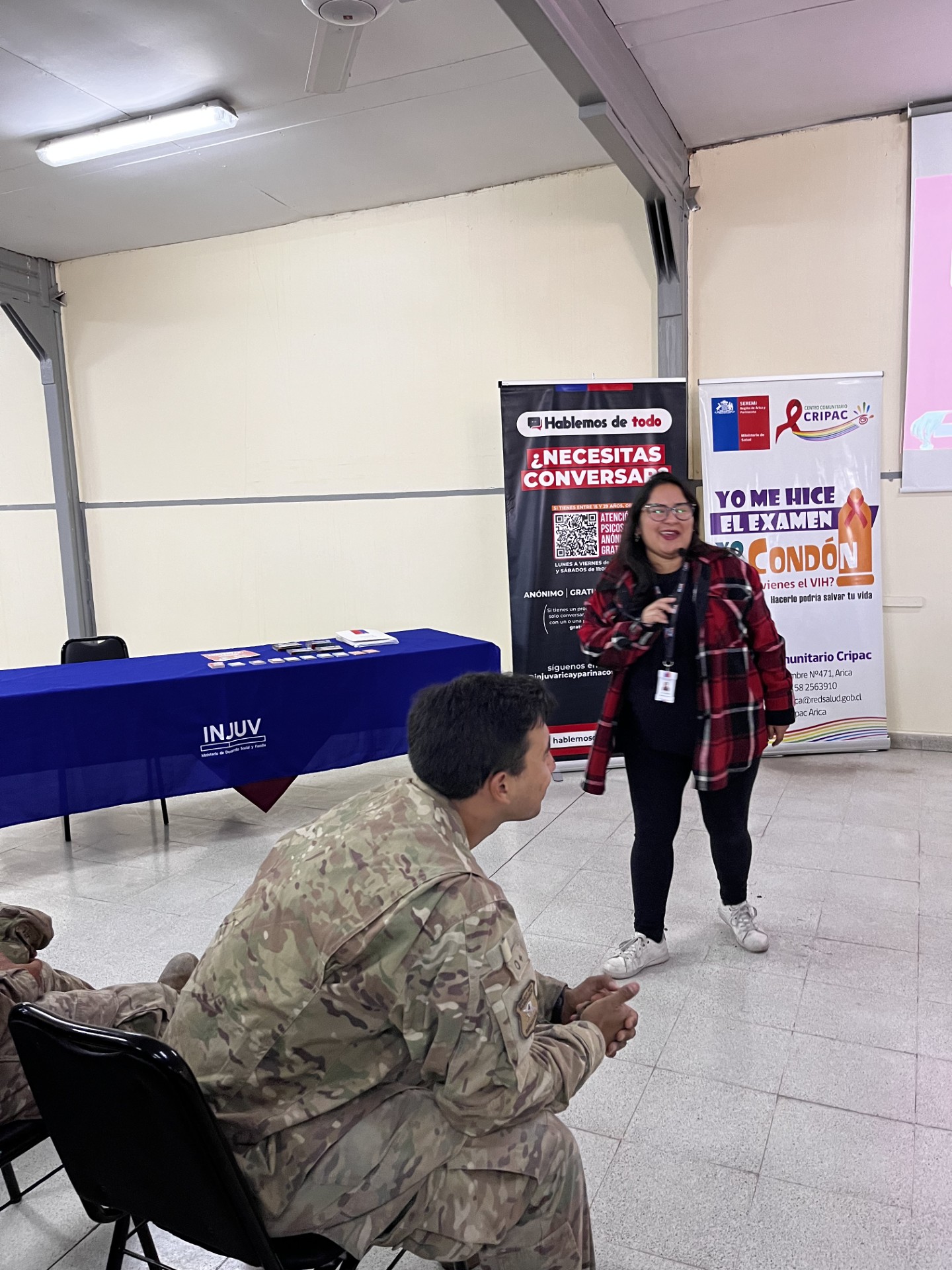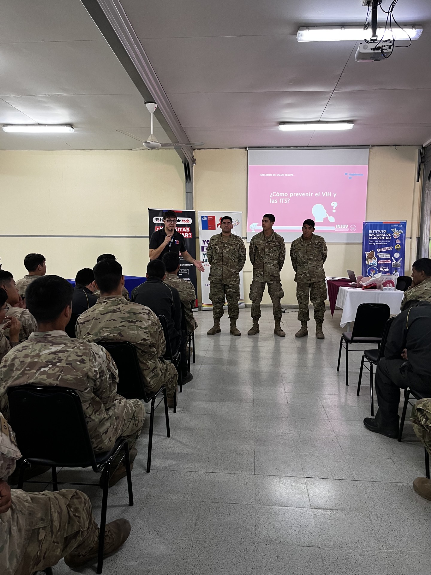 El profesional de CRIPAC Diego Vallejos, explicó que “vinimos a conversar junto a INJUV acerca de cómo cuidarse de las infecciones de transmisión sexual, el uso correcto del preservativo, compartir experiencias, entre otros temas. La idea es intervenir en ellos porque están recién llegando a la región, así que les queríamos mostrar lo que hace el CRIPAC, y decirles que estamos para lo que necesiten durante el tiempo que hagan el servicio militar en Arica”.